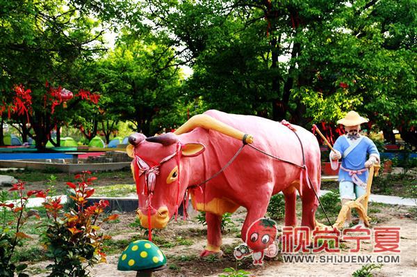 隆德神林山庄的百年梨园耕牛雕塑...