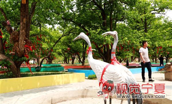 隆德神林山庄的百年梨园仙鹤雕塑...